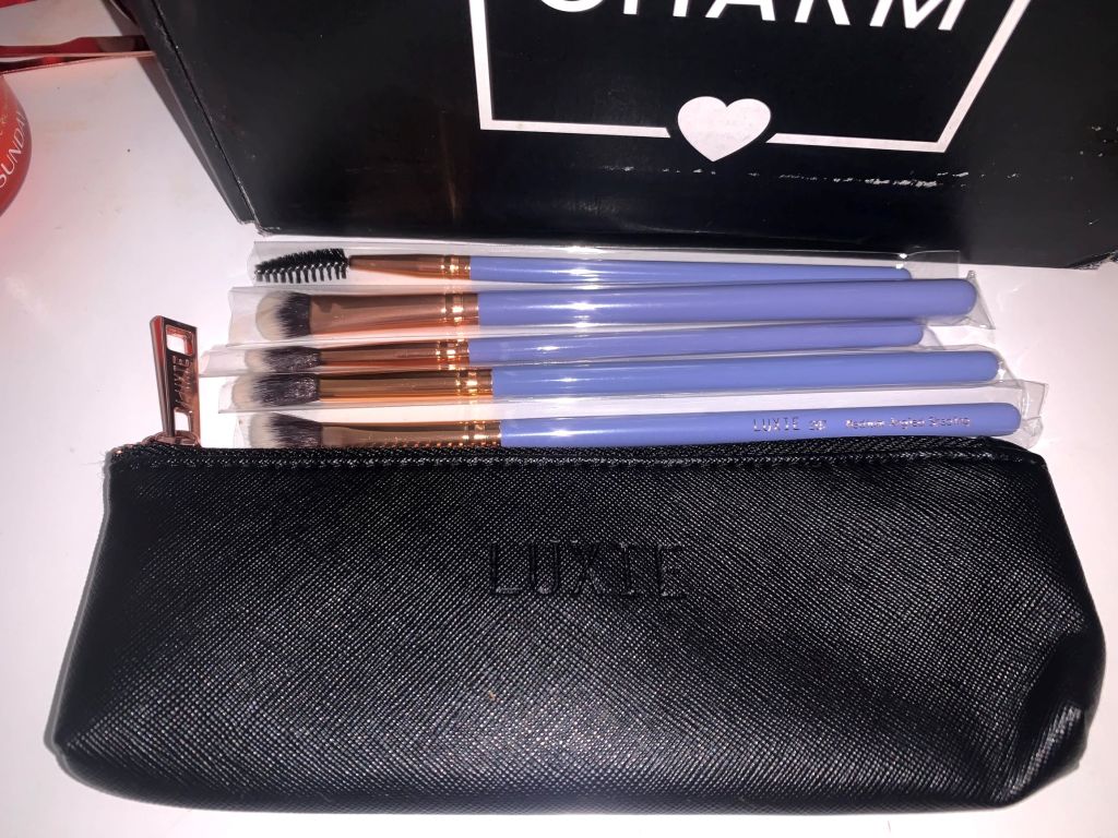 The Luxie ‘Wonderlust Set’ is a cute, purple 5-piece brush set. It includes a tapered shading brush, blending brush, medium angled brush, larger shader brush and a brow & lash brush all inside a black pouch with Luxie on it.
